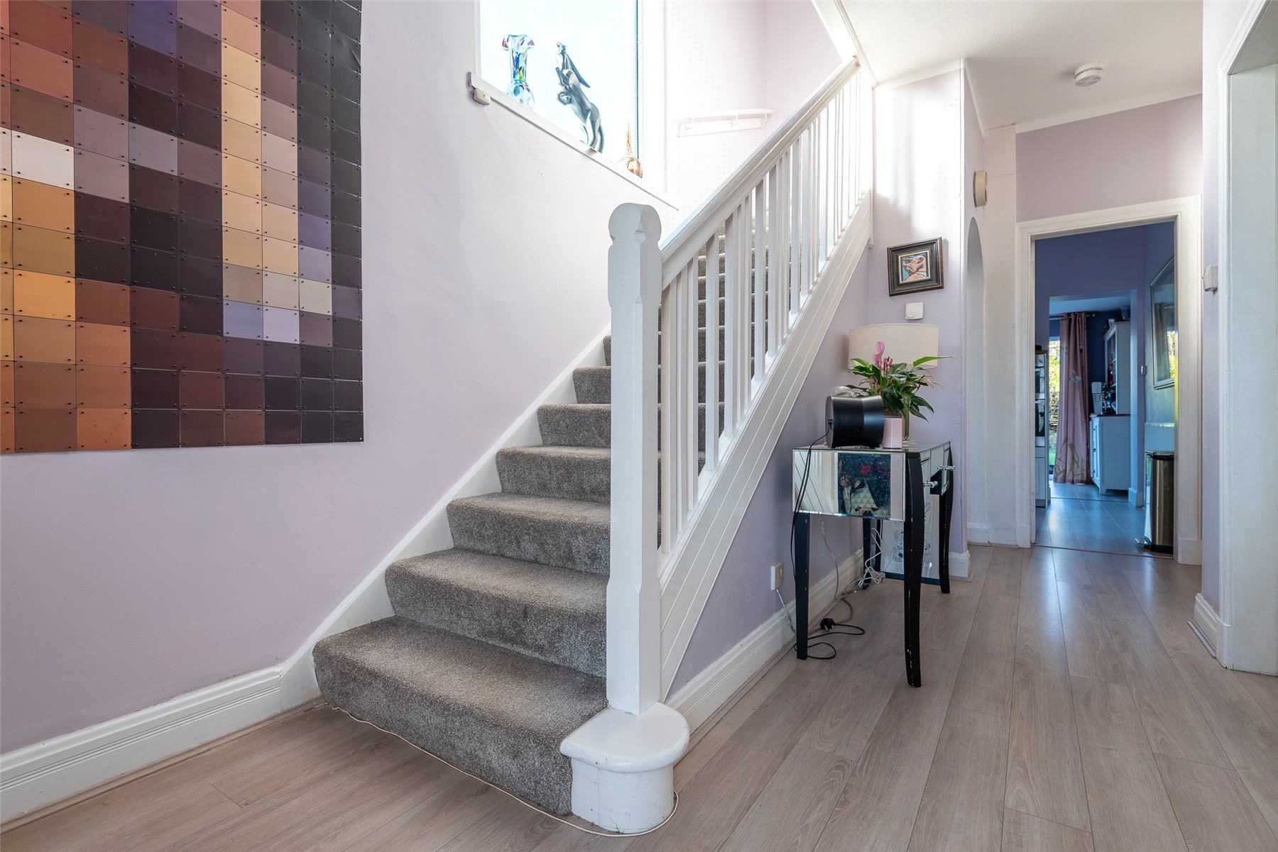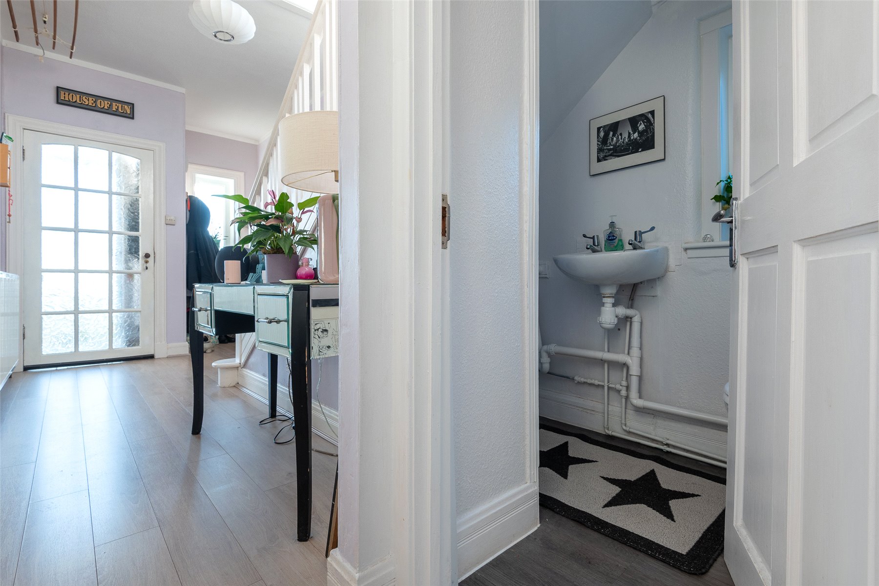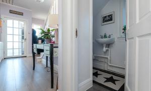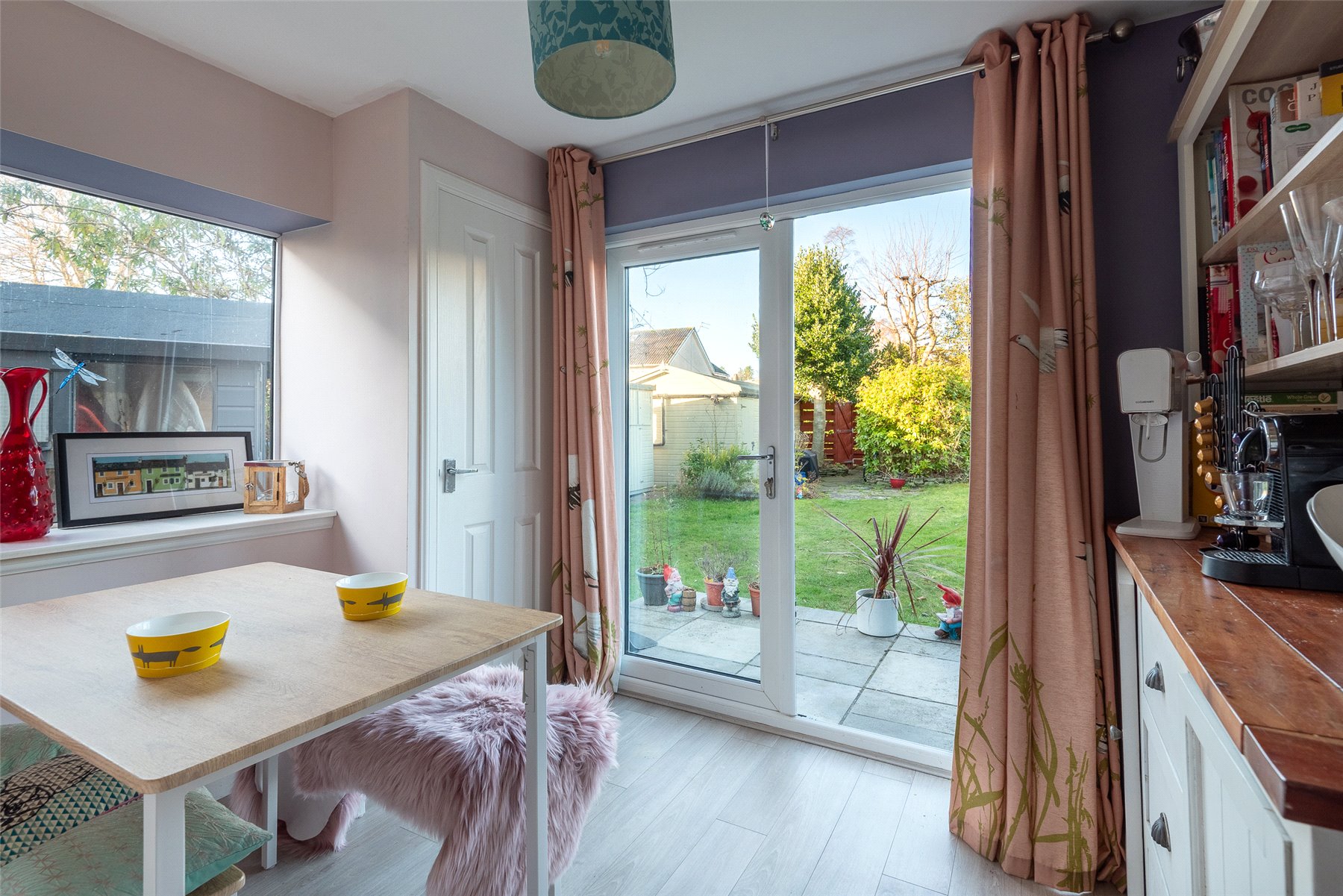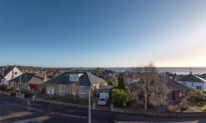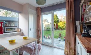 The accommodation is bright, welcoming and well-presented throughout. A vestibule leads into the hallway, giving access to the spacious lounge, which features tasteful décor, a charming bay window that captures the views, and a stylish stove fire. The modern fitted kitchen sits to the rear and flows naturally into the adjoining dining room, a versatile space with patio doors opening out to the garden, ideal for family living, entertaining, or use as a cosy snug. The ground floor also benefits from a contemporary WC and a generous double bedroom.