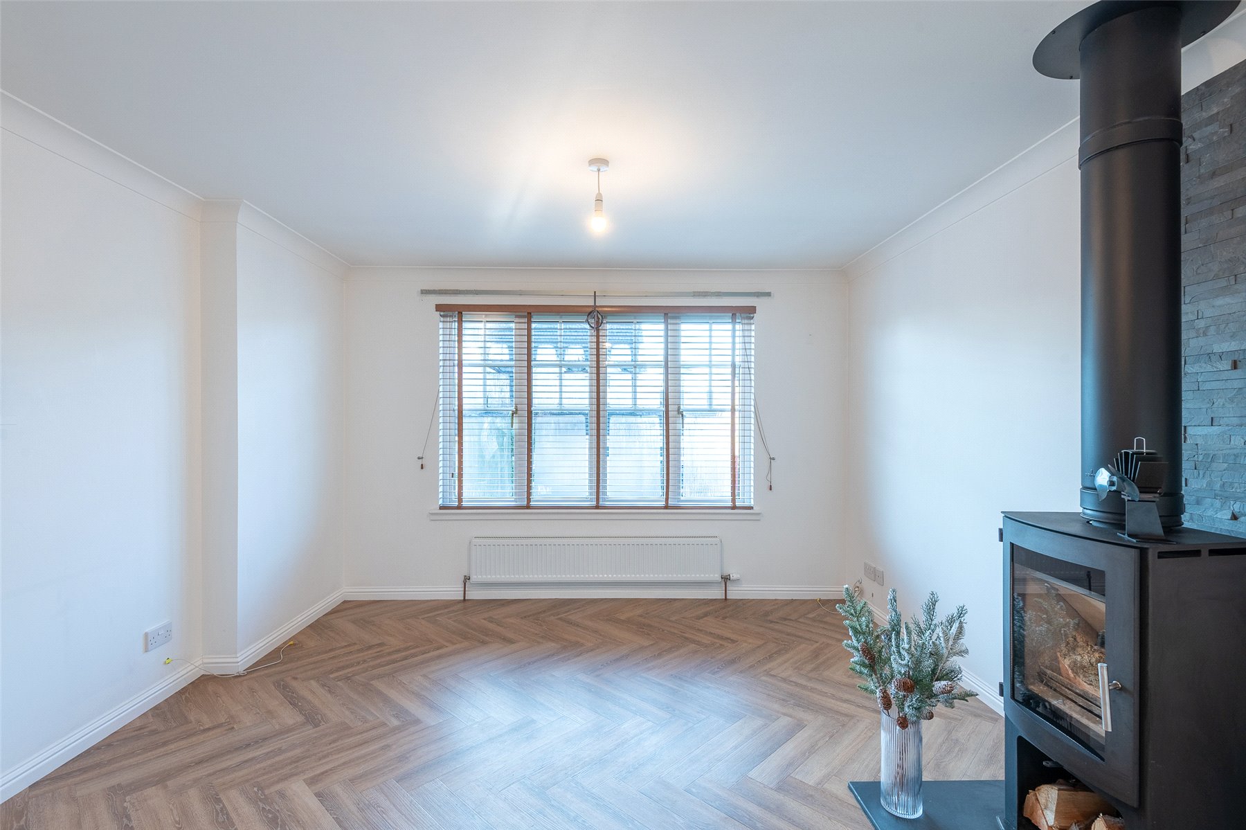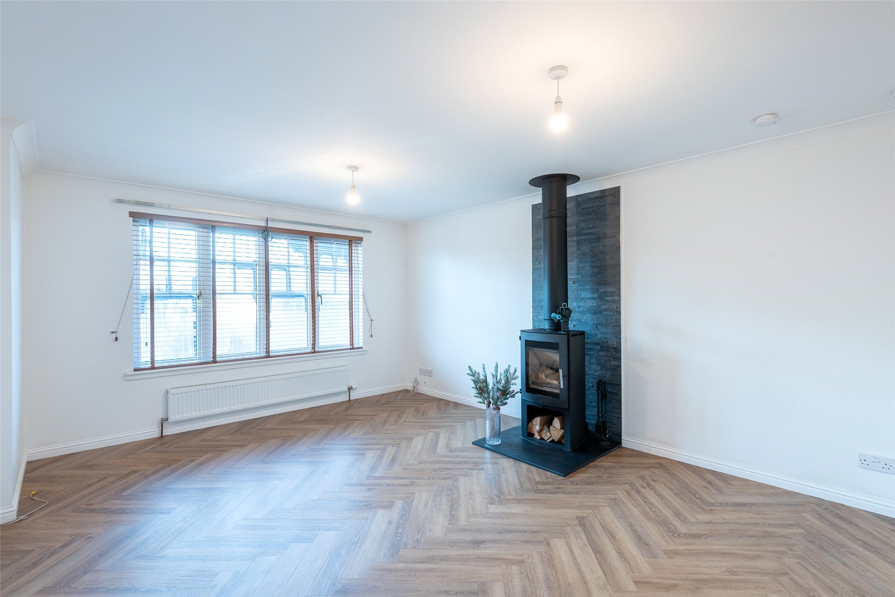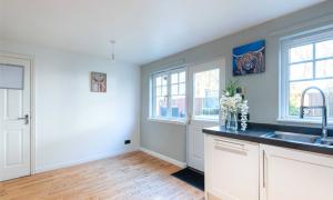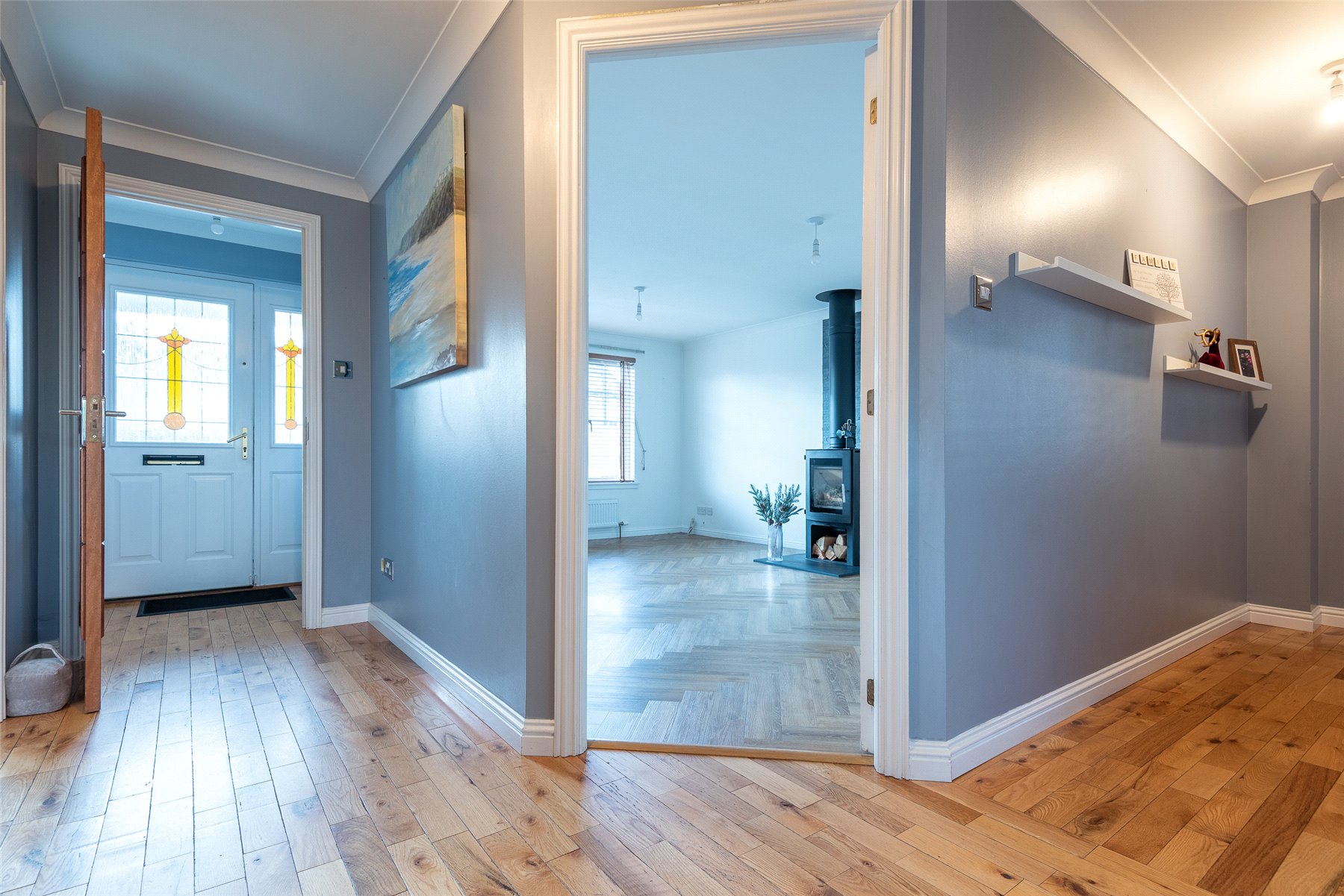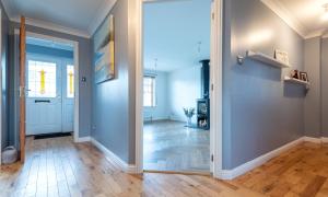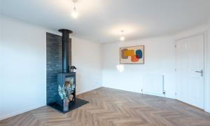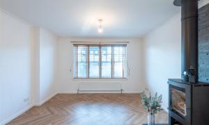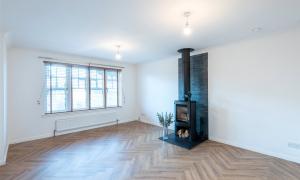 A welcoming hallway leads into the modern kitchen and dining area, which provides generous worktop and cupboard space. The adjoining dining room can be reached from both the kitchen and hallway and enjoys patio doors that fill the room with light and open onto the garden. The lounge is another bright and inviting space, featuring a charming wood burning stove at its heart.