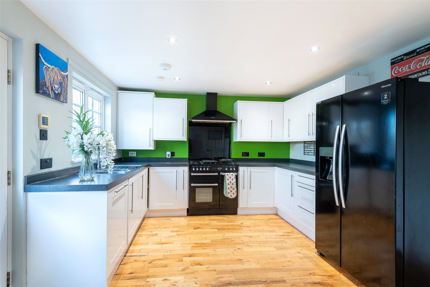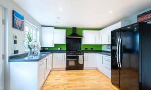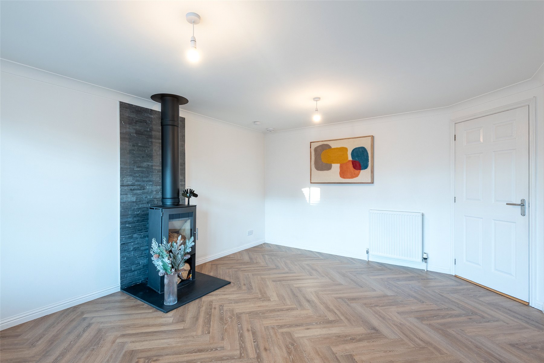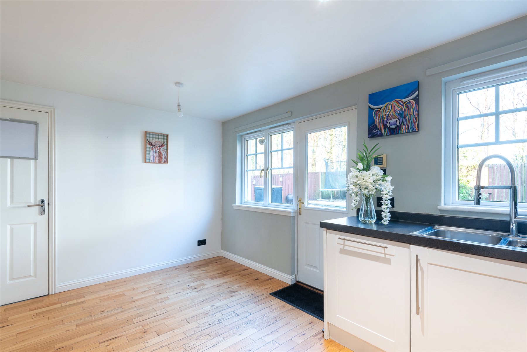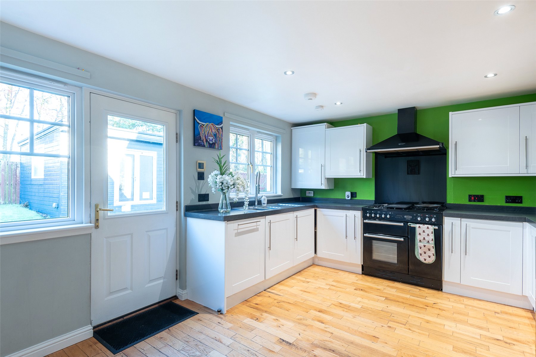 A welcoming hallway leads into the modern kitchen and dining area, which provides generous worktop and cupboard space. The adjoining dining room can be reached from both the kitchen and hallway and enjoys patio doors that fill the room with light and open onto the garden. The lounge is another bright and inviting space, featuring a charming wood burning stove at its heart.
