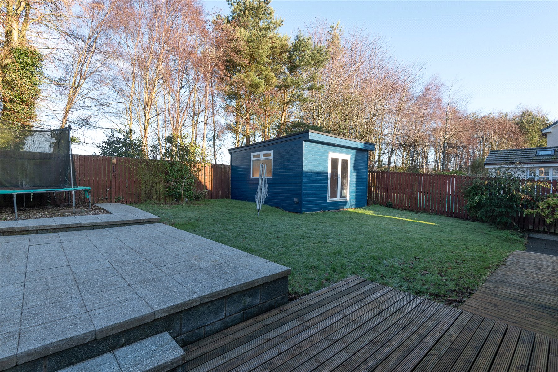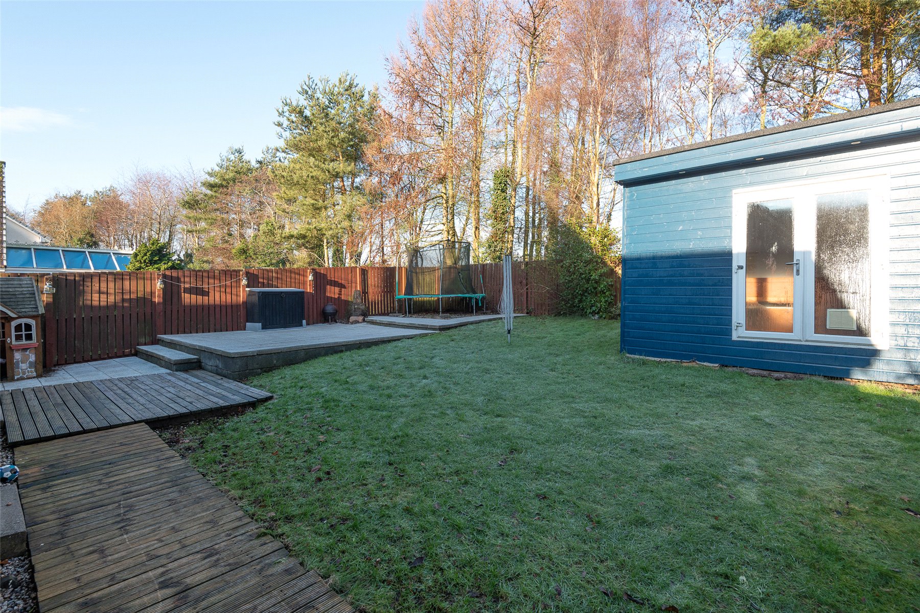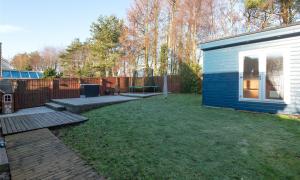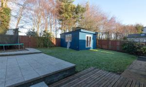 Externally, the home has a neat front lawn with a beautiful Tibetan cherry tree and a wood store to the side. The driveway leads to the partially converted garage, which provides practical storage. The large, fully enclosed rear garden is a standout feature, mainly laid to lawn with generous patio and decking areas.