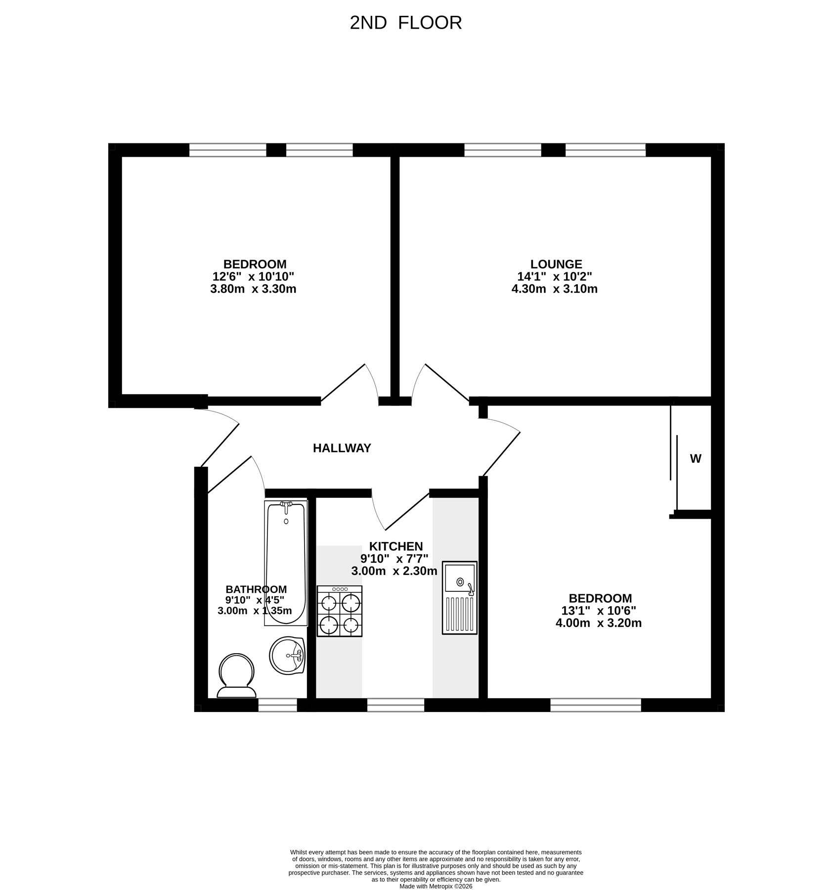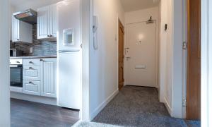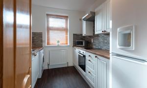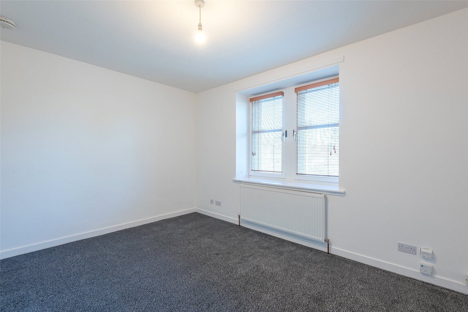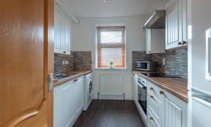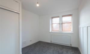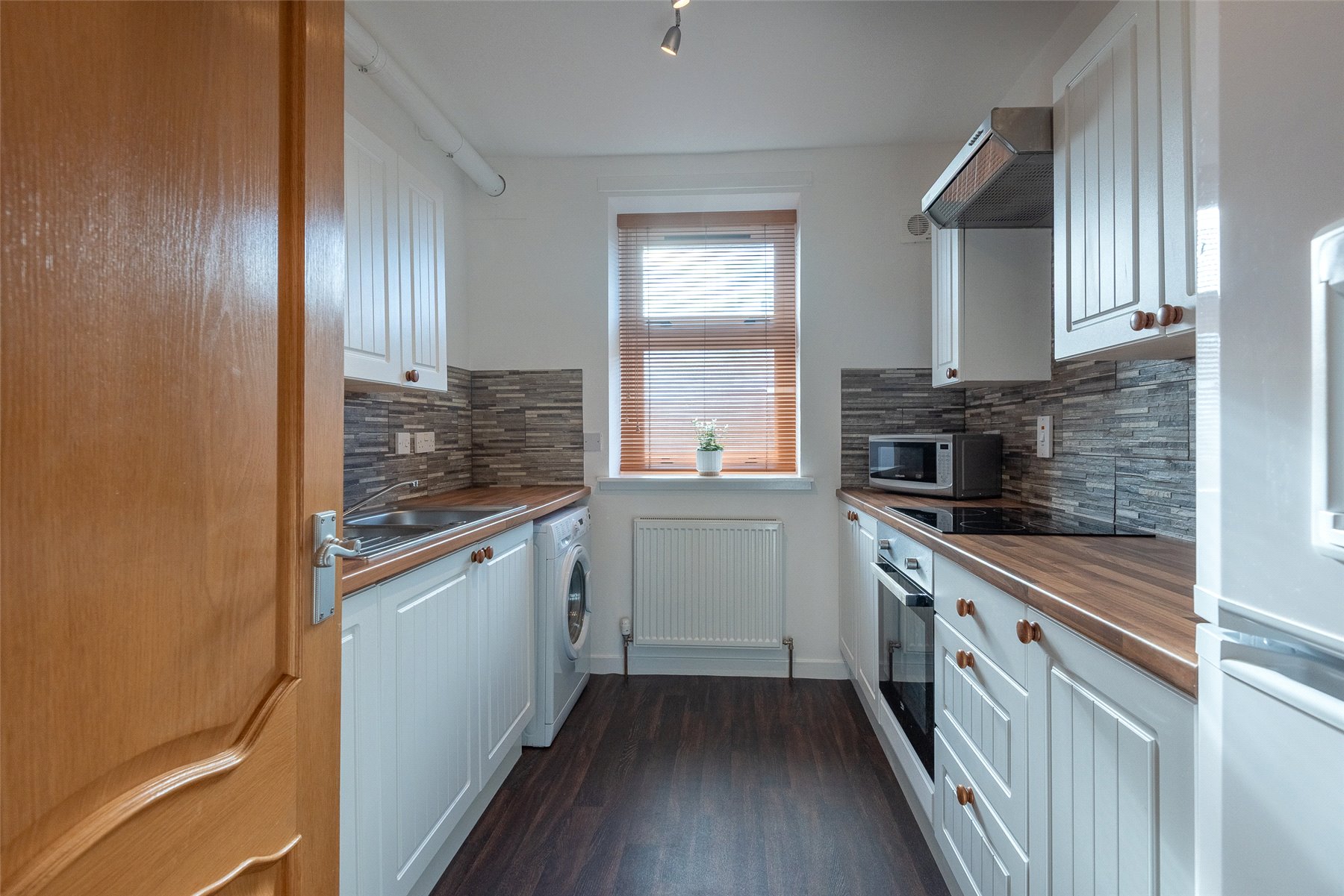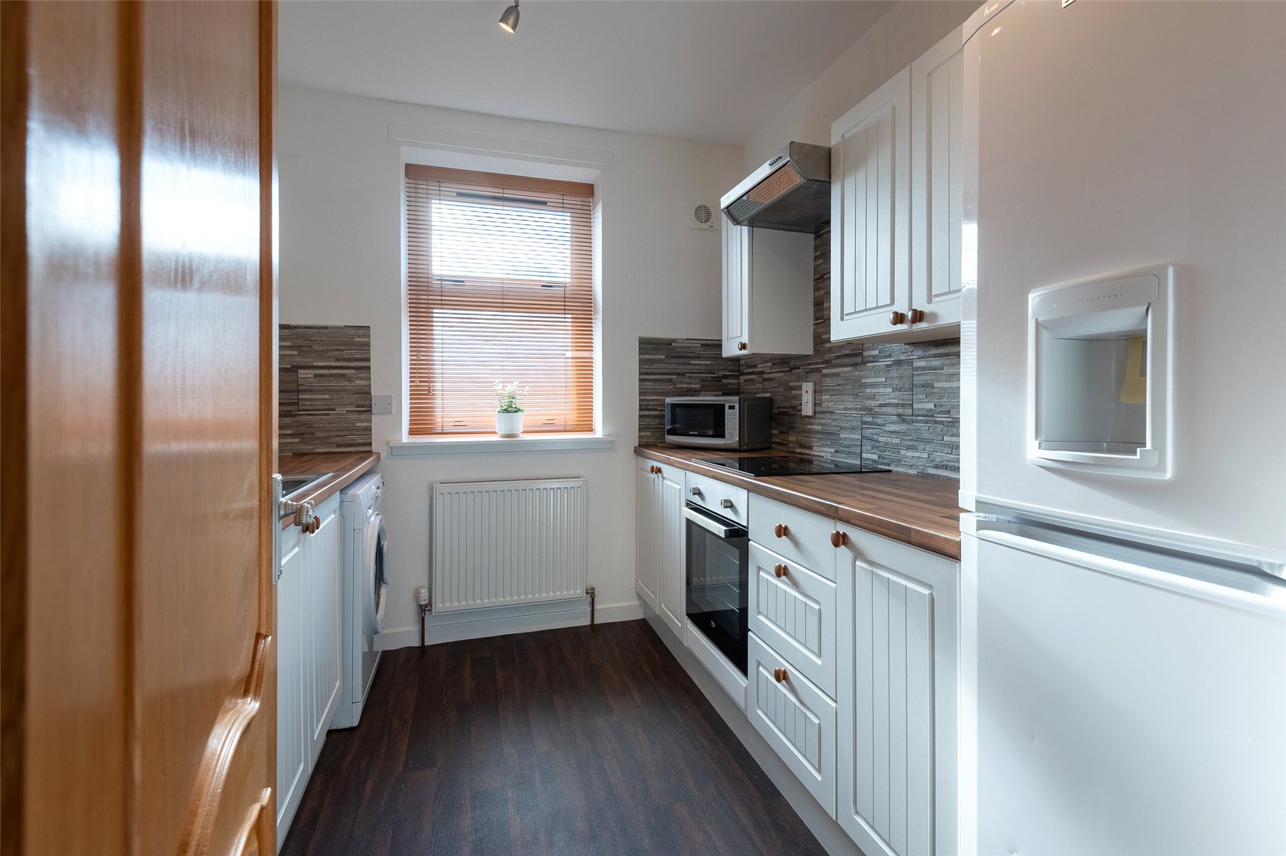 The accommodation comprises an entrance hallway, good-sized lounge with windows to the front, kitchen with a range of units with integrated hob, oven and hood and space for fridge-freezer and washing machine, two double bedrooms with fitted wardrobes, and a bathroom with white suite with instant shower. Outside to the rear is a communal garden with clothes drying poles. Included in the sale are the fitted floor coverings, window blinds and integrated kitchen appliances as detailed.