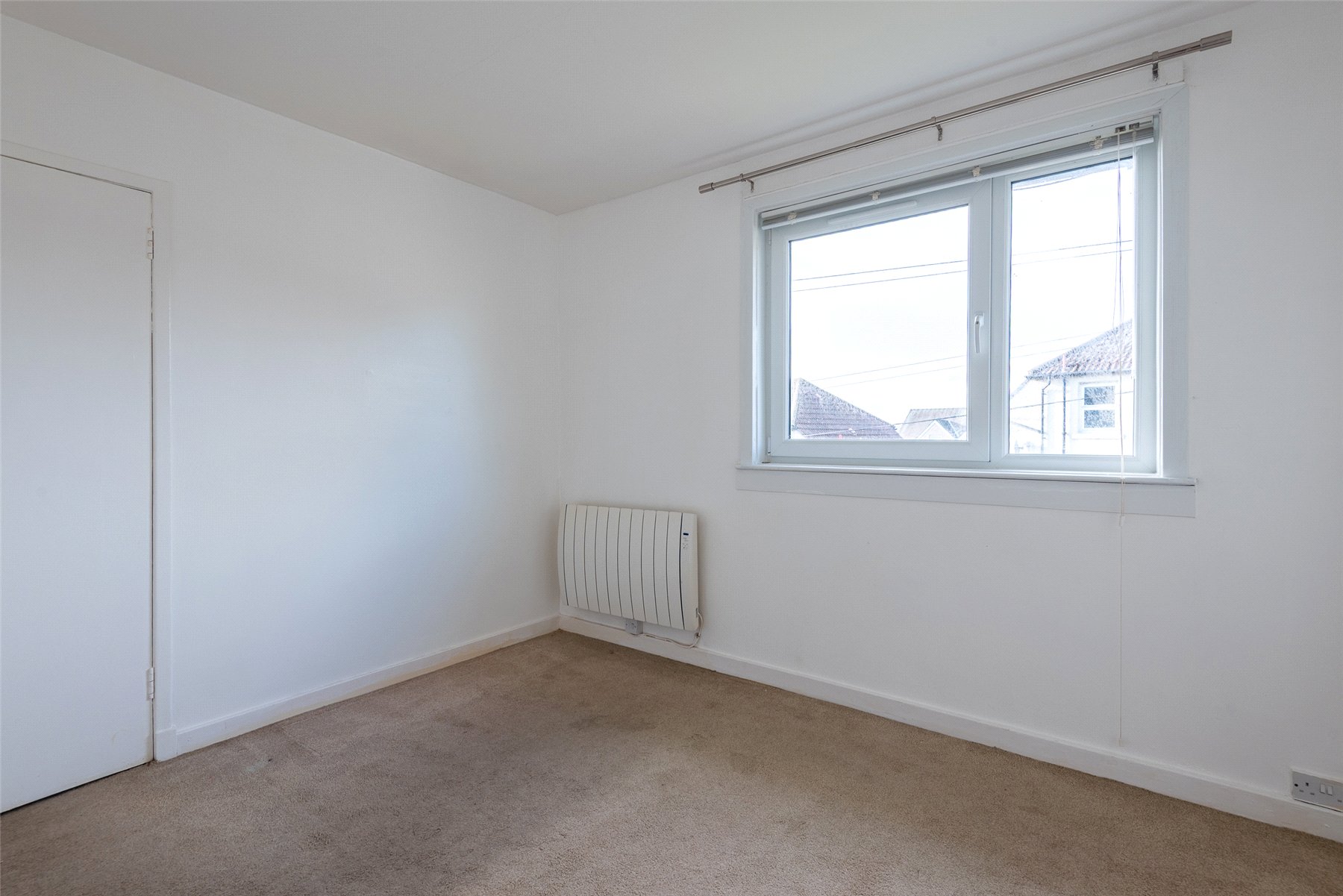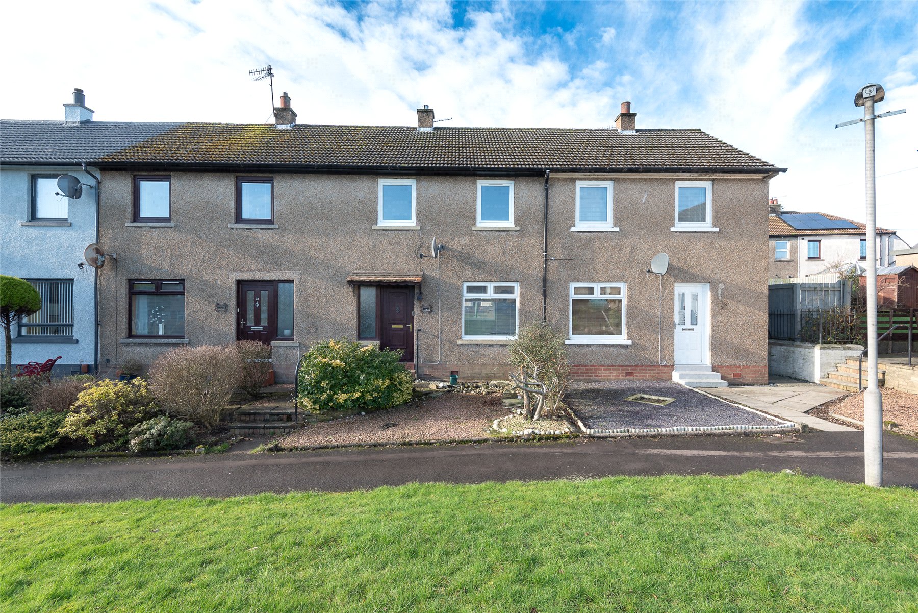 The property offers good-sized accommodation comprising: hallway, lounge/dining room with windows to the front and rear, kitchen with integrated hob, oven and cooker hood and space for other appliances, two double bedrooms with built-in storage and a fully tiled shower room with instant shower. Outside to the rear the garden has lawn and borders, with the front being the same. Benefits include double glazing and electric heating.