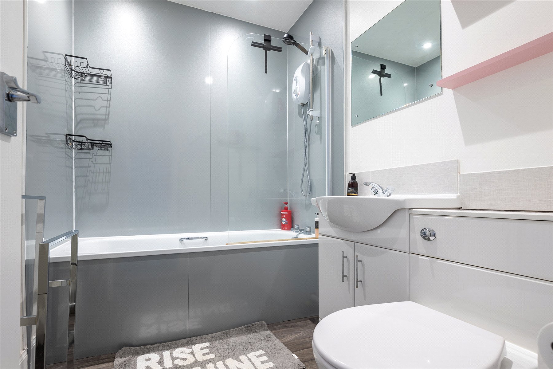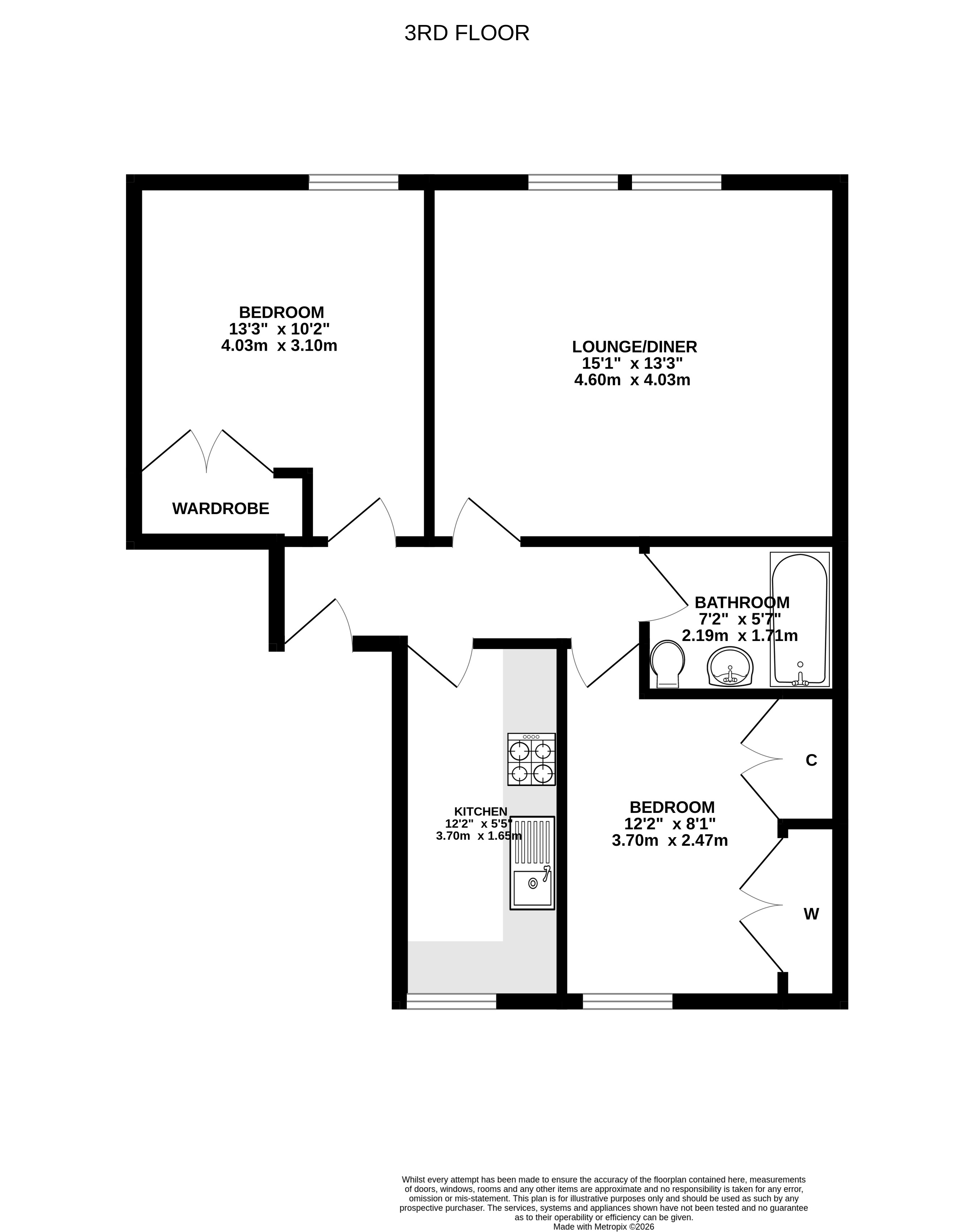 The accommodation comprises an entrance hallway, good-sized lounge with original ceiling cornice and windows to the front, kitchen with a range of units with integrated hob, oven and hood and space for fridge-freezer, tumble dryer and washing machine, two double bedrooms, both with fitted wardrobes, and a bathroom with white suite with instant shower and glazed screen over the bath. Outside to the rear is a communal garden with clothes drying poles. Included in the sale are the fitted floor coverings, window blinds, integrated kitchen appliances as detailed and fridge-freezer (no warranty provided).