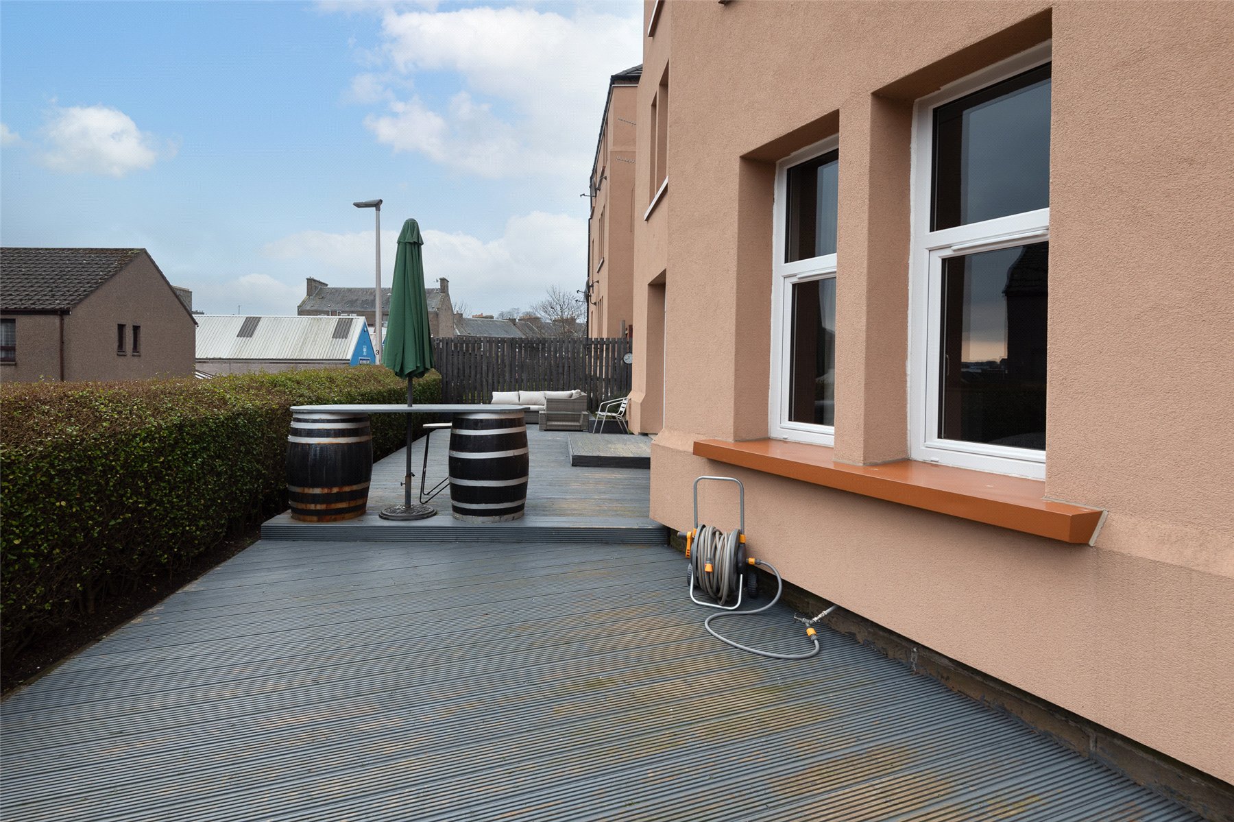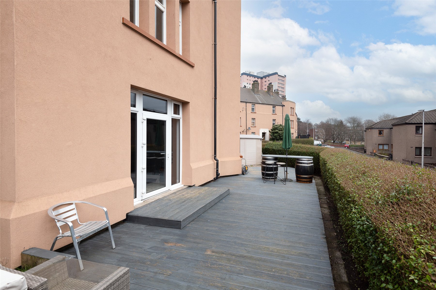 The accommodation comprises: entrance hall with storage cupboard, a good-sized lounge with French doors opening out to the private garden, kitchen/breakfast room with integrated hob, oven, extractor hood, fridge, freezer and space for a washing machine and breakfast table and chairs, two good sized bedrooms, both with built-in wardrobes, and the modern shower room with built-in vanity storage and large shower enclosure with thermostatic shower. Outside to the rear of the property there is a shared garden with clothes drying poles, whilst to the front is the private, south-facing garden with privacy hedge, garden shed and large deck perfect for enjoying the sun and outdoor entertaining. Included in the sale are all fitted floorcoverings, integrated kitchen appliances as detailed, window blinds (where fitted) and garden shed.