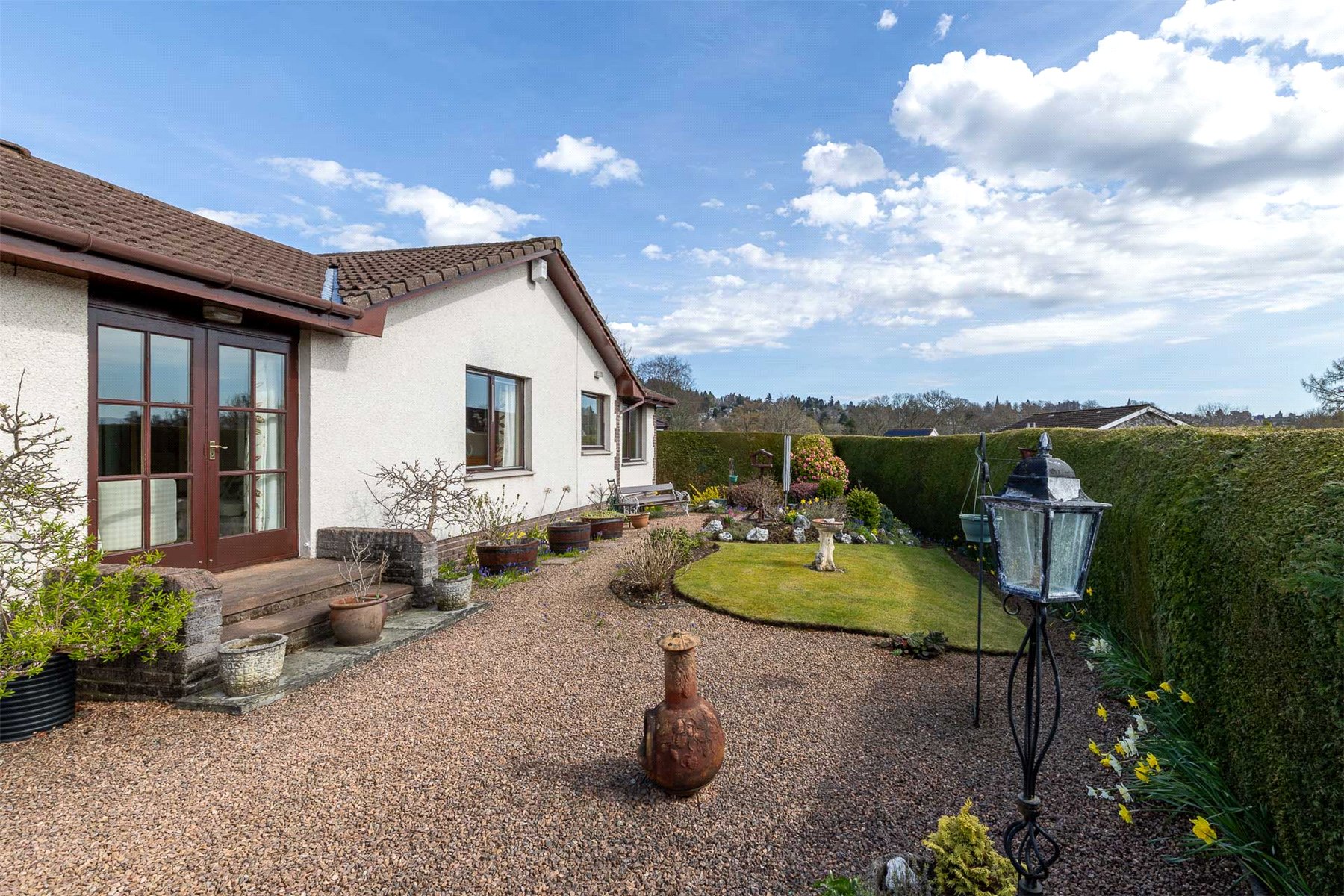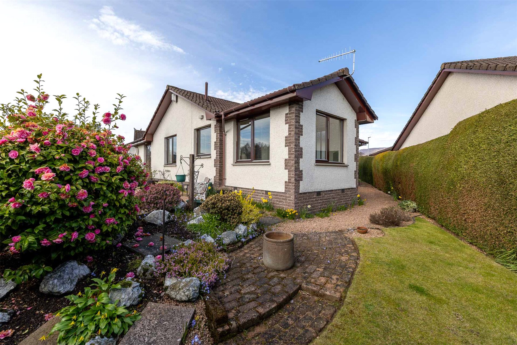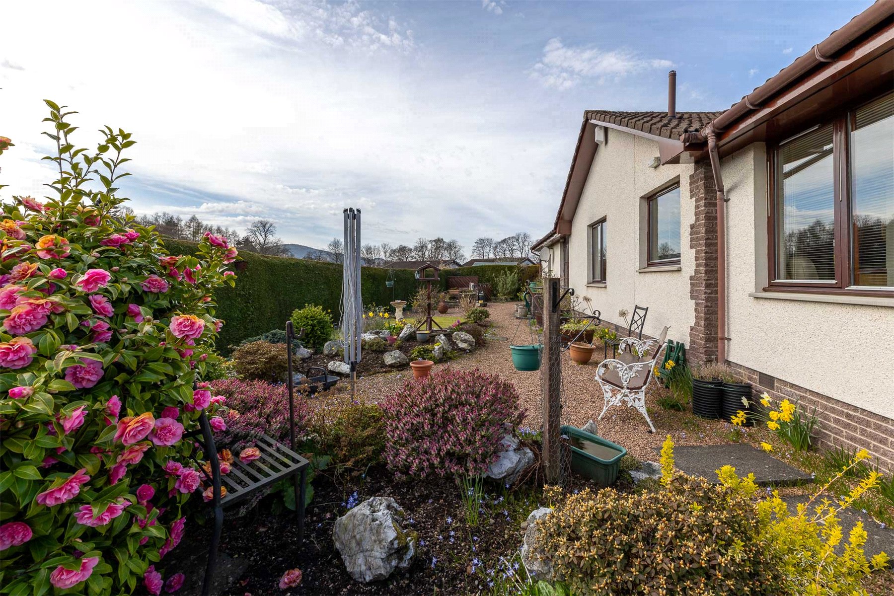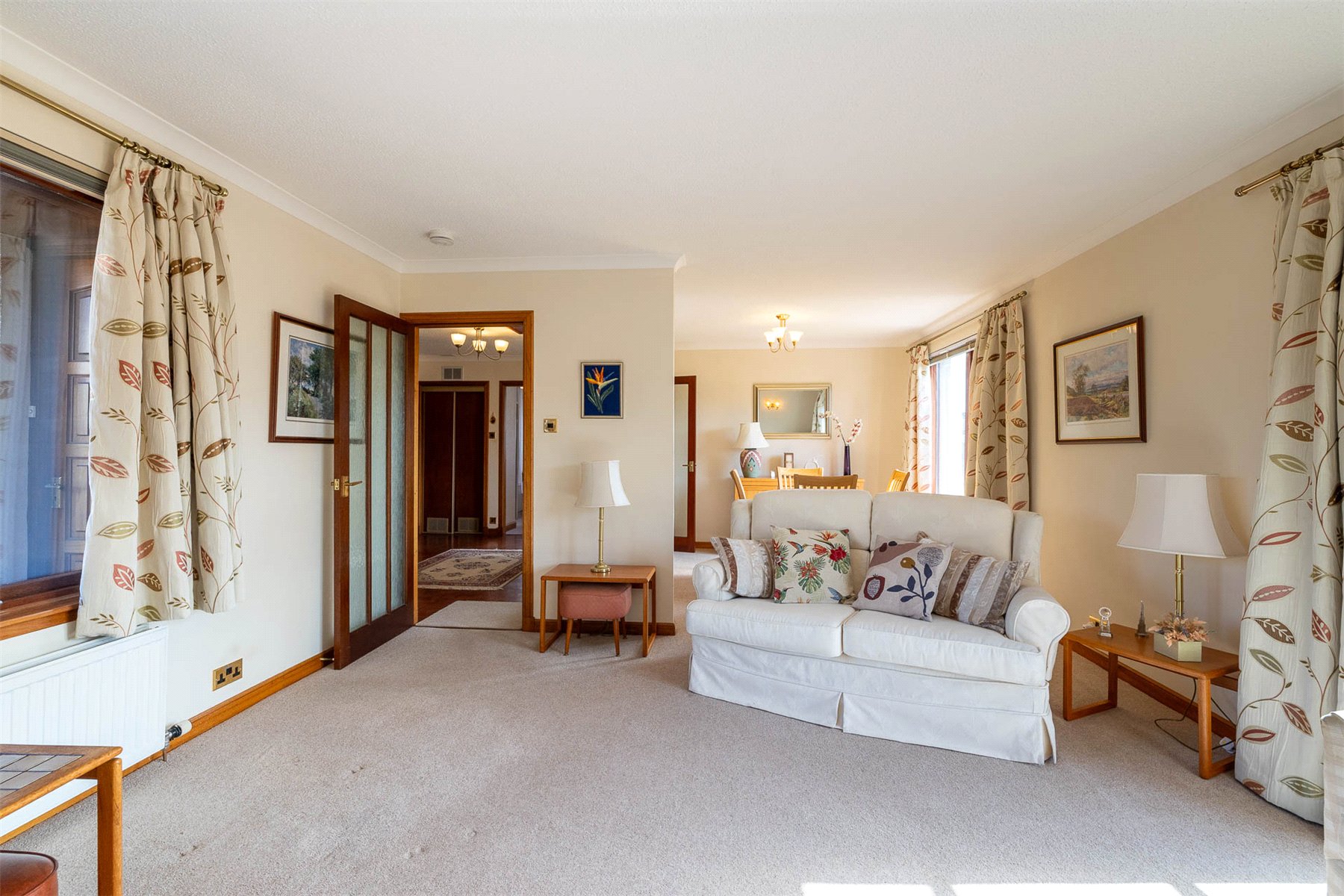 The layout includes a spacious hallway with useful storage and access to the floored attic, a bright rear-facing lounge with garden access and space for dining and a fitted kitchen with integrated appliances open to a second reception room. There are 2 bedrooms with built in storage, including 1 with an en suite shower room, and a family bathroom with bath, wash hand basin and WC. Gas central heating and double glazing ensure year-round comfort and efficiency. Externally, the property continues to impress. A gravelled driveway offers ample parking and leads to a single garage. The enclosed rear garden is south facing and offers good privacy and there are areas of lawn and colourful mature planting to both front and rear. Owned by the same family since its construction, number 9 is a rare opportunity to acquire a well-appointed and adaptable home in a prime location. Early viewing is strongly recommended. Crieff is a traditional Scottish market town set amidst Perthshire's stunning scenery. The attractive and bustling town centre supports a wide range of businesses offering the best of food and drink, clothing, gifts, crafts and arts.