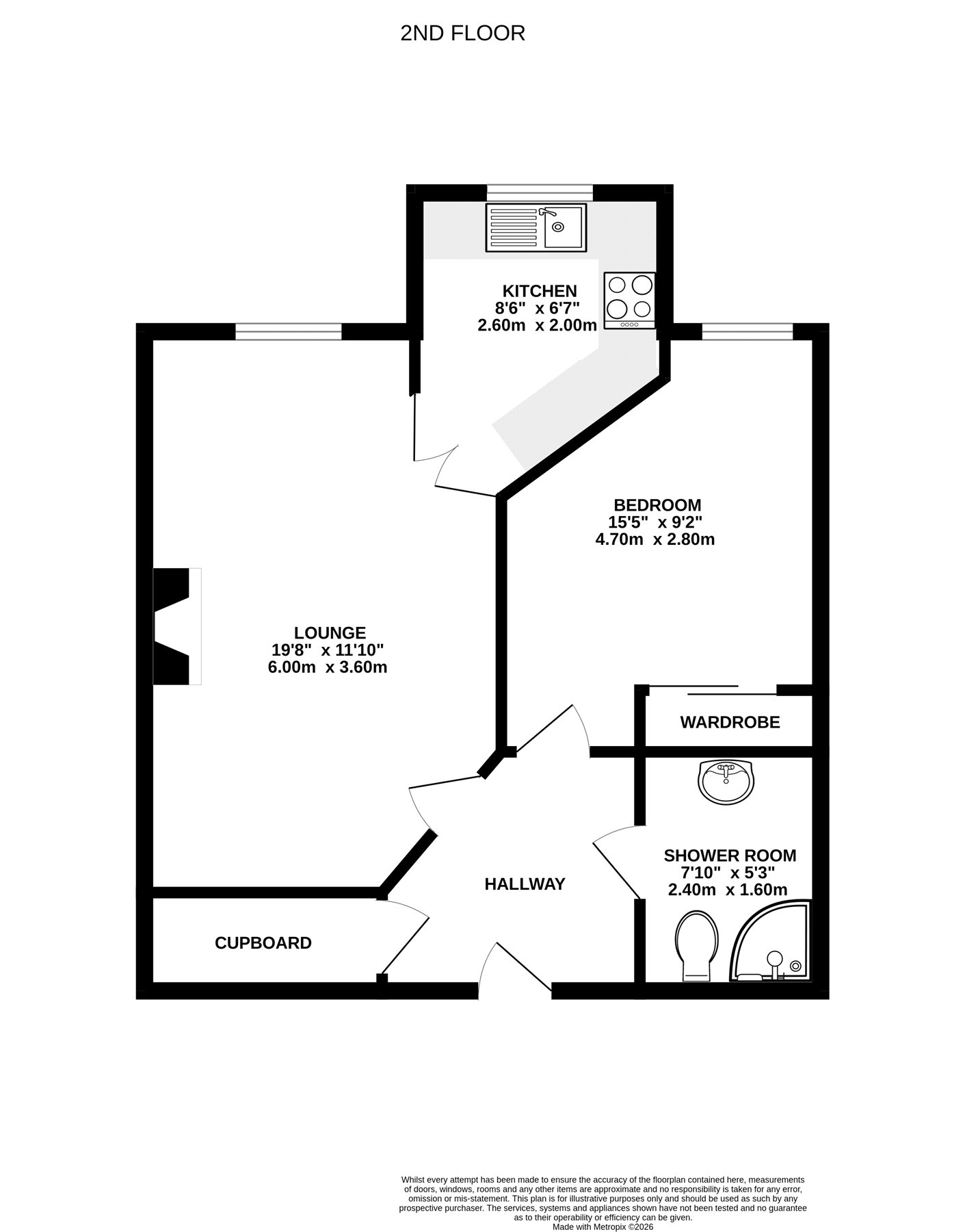 which is flooded with natural light. The compact kitchen is accessed from the lounge. There is a good sized double bedroom benefitting from fitted wardrobes, shower room and a spacious storage cupboard. The roof on the building has recently been replaced and benefits from a 15 year guarantee.