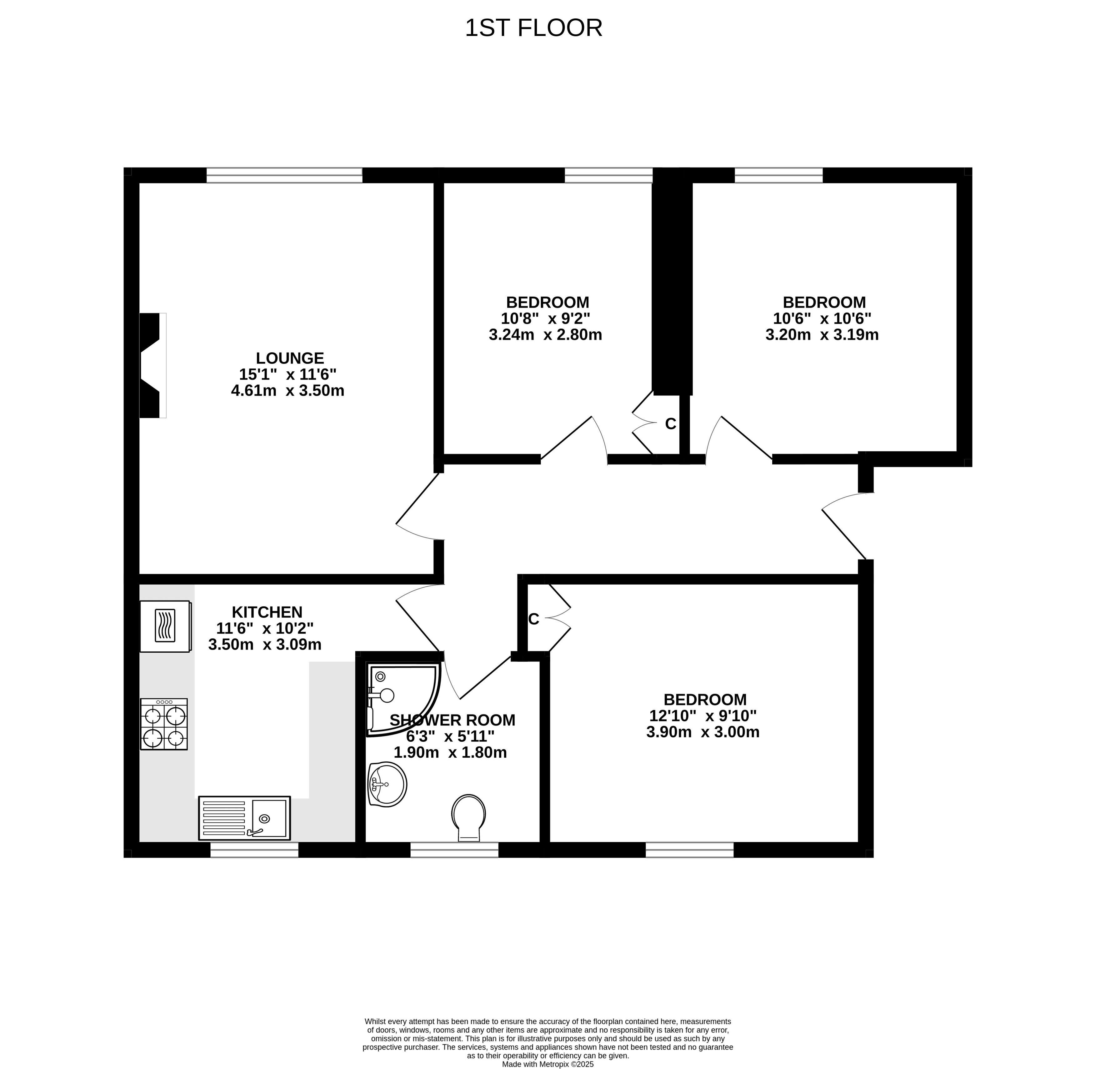The accommodation is all accessed from the hall which has a built-in storage cupboard and hatch providing access to the attic space via ‘Ramsay’ style drop ladder. The lounge is a bright, south facing room with feature fireplace with electric fire. The kitchen is fitted with a range of units with integrated hob, double oven, extractor hood and dishwasher. All three bedrooms are a good size with the wardrobes in bedroom one being included in the sale. The shower room has a white wc, wash hand basin, plenty of vanity storage and a new shower enclosure with thermostatic shower.